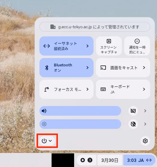 - 再起動により画面が映らないなどの不具合が起きる場合があります.対処法については「Chromebookを起動した際,ドックが認識されない問題(外付けディスプレイが映らない・キーボード等が認識されない)」を参照してください.