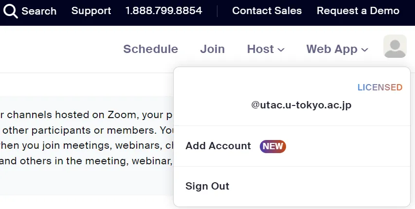 4. If you see “Licensed” with your Common ID after clicking the icon in the top right corner of the Zoom settings page (a human silhouette or a profile picture that you have set up), you have successfully signed into Zoom with your UTokyo Account.