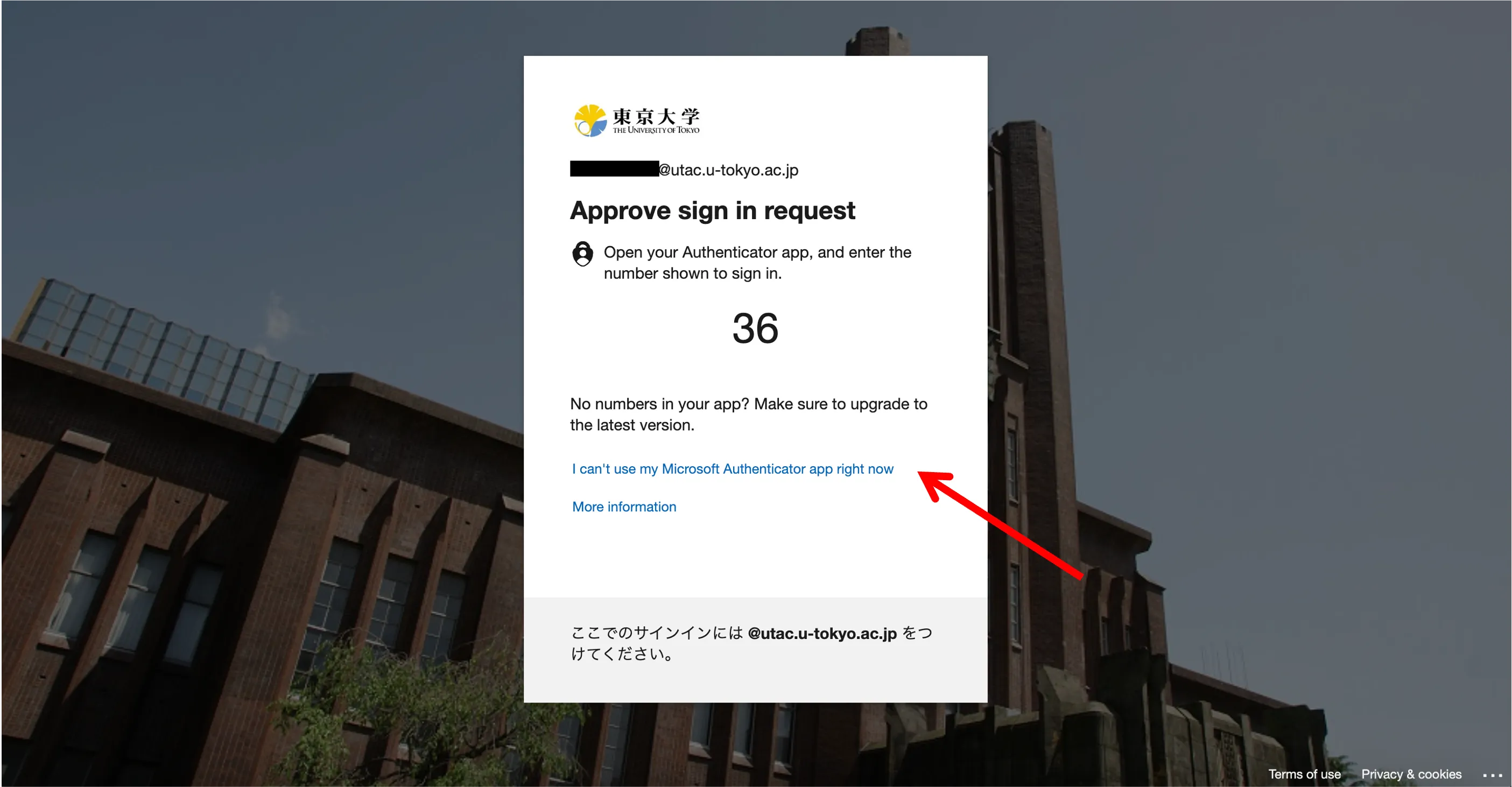 - Once you sign in to your UTokyo Account (after you enter your password), the screen for the default multi-factor authentication verification method will be displayed. Please click on the “Having troubles? Sign in another way” or “I can’t use my Microsoft Authenticator app right now”.