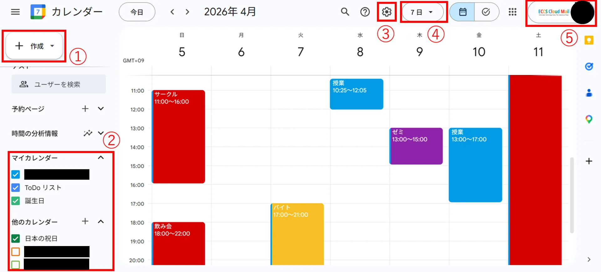 画面中央の表になっている部分には予定が表示されます.また,①では予定を作成することができます.②にはカレンダーの一覧があります.さらに,③,④,⑤ではそれぞれ,カレンダーに関する設定,カレンダーの表示方法,使用するアカウントを変更できます.
